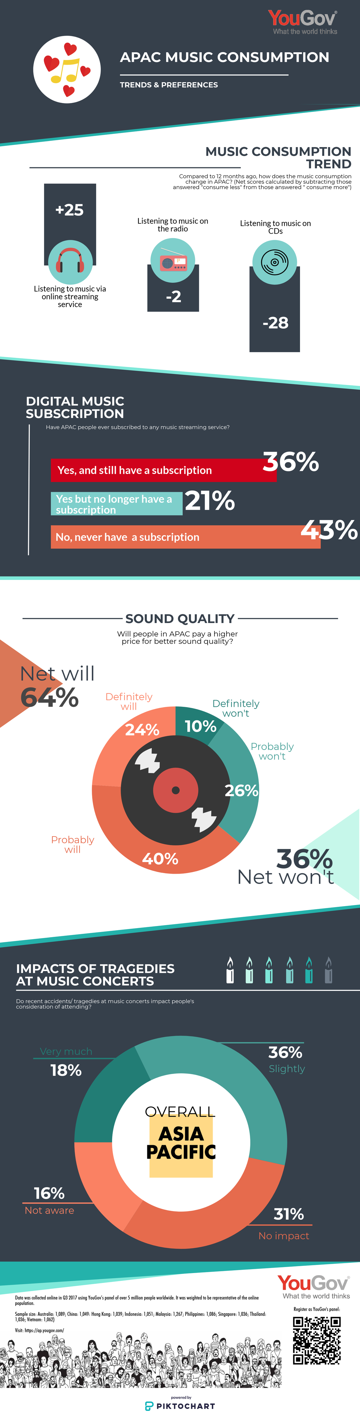 Across APAC, 36% of online consumers are currently subscribing to a music streaming service, while another 21% have subscribed previously but stopped now.